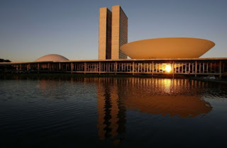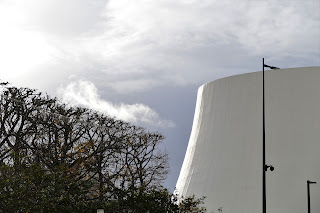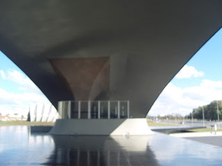 Il y a dans cette architecture, des jeux récurrents avec l’eau et la lumière. Le soir, le blanc se dore sur le palais de l’assemblée. Nous avions pénétré dans l’un des ministères : pas de porte dans ce bâtiment. Mais un espace entre les passages de l’eau et les étages filtrait les entrées.