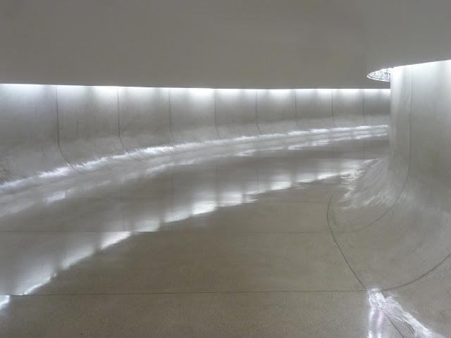 Ci-dessous, c’est la rampe d’accès à l’Oeil. On a l’impression d’être dans une gigantesque coquille d’huître. Le matériau intime une attitude silencieuse, délicate. Pas de marche, tout est rondeur, rappelant en cela les principes d’architecture de Hundertwasser dont je vous parlerai plus loin. Grande expérience inoubliable.