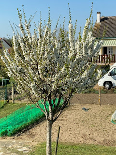 En accord avec la couleur de la semaine, mon cerisier n’a jamais été aussi blanc. Le jardin est prêt : les petits pois grimpent gentiment, les salades grossissent pas très vite…