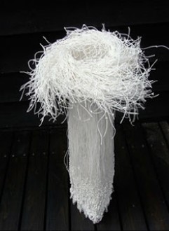 Le commissaire d’exposition Erny PIRET dit son souhait de présenter lors de cette manifestation, uniquement des artistes qui utilise la matière et les savoir faire, la polychromie devenant accessoire. Kakuho ISHII ne travaille pas seulement en blanc, et ce musée a présenté lors d’autres manifestations, des pièces colorées. En regardant ces œuvres, on ne voit plus la matière, on est emporté par les formes, la fragilité de ces fibres, le langage technique si semble si simple et demande une parfaite maîtrise. Elle emploie la technique du MIZUHIKI, travail de bandelettes tissées, nouées. Les formes suggèrent le monde végétal mais nous laisse libre de nos interprétations. Lorsque je vois ces œuvres, je suis transportée dans un monde d’élégance et de raffinement comme lorsque je vois le travail des porcelainiers. Pas de grands gestes, pas de bruit, un monde intérieur, un foisonnement de sensations apaisantes. Quelle puissance pour révéler autant de force dans ces petits formats.