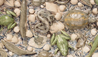 Bernard Palissy est le céramiste du XVIe. Il a fait beaucoup de recherches pour trouver la recette de la porcelaine sans y parvenir. Mais il a découvert des glaçures formidables, encore source de curiosités, et on commence à découvrir ses recettes. Son savoir-faire pour les moulages est aussi source d’intérêt majeure. Vous verrez les différentes couleurs, les grains sur les différents animaux, les formes bien reconnaissables. Huguenot, il est pourchassé, échappe de peu à la St Barthélemy, est protégé par la Reine puis finira embastillé.