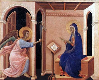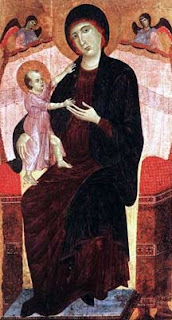 A la même époque, Duccio di BUONINSEGNIA utilise le rose pour parer l’enfant Jésus et les drapés des anges :