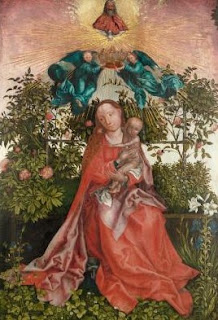 Si vous allez à Colmar, vous aurez sûrement l’occasion de vous arrêter à l’église des Dominicains. Regardez le retable de la Vierge à l’Enfant : ici le buisson est fait de roses. La copie du tableau original faite au XVIe vous montre que le ciel est rosé. Le ton devient une couleur céleste symbole de féminité, de délicatesse, et d’innocence.