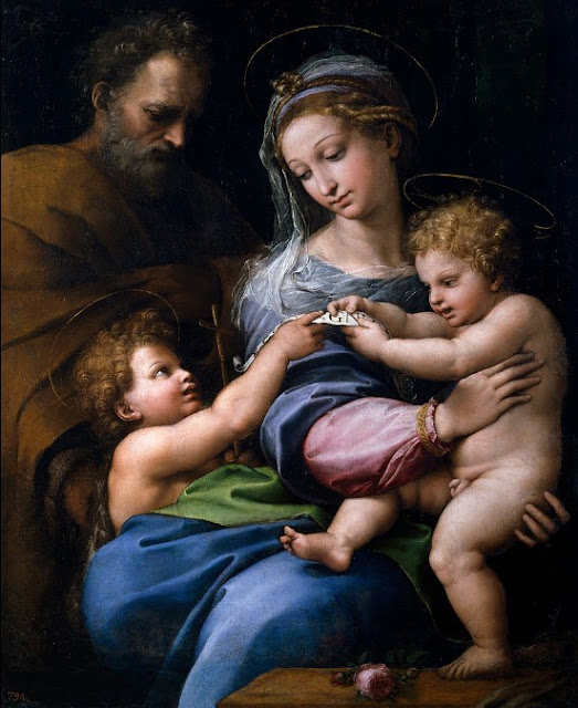 Raphael dans sa vierge à la Rose (1518 – 1520), montre le symbole du mariage spirituel entre la mère et l’enfant, pour atteindre la divinité.