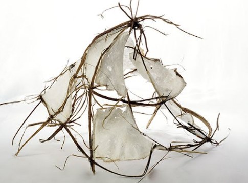 « Les objets délicats et légers en papier sont un défi attractif. Rien n’y contribue, l’air fait partie des oeuvres d’art, les trous soulignent la tendresse. Le blanc du papier contraste avec les matières sombres de la nature ou les pièces de fer rouillé de la casse, la légèreté contraste avec le lourd. Les œuvres sur papier respirent un esprit d’inspiration lumineuse, sont comme des êtres naturels qui fredonnent, tourbillonnent et racontent tranquillement, ils pourraient faire des sons. »