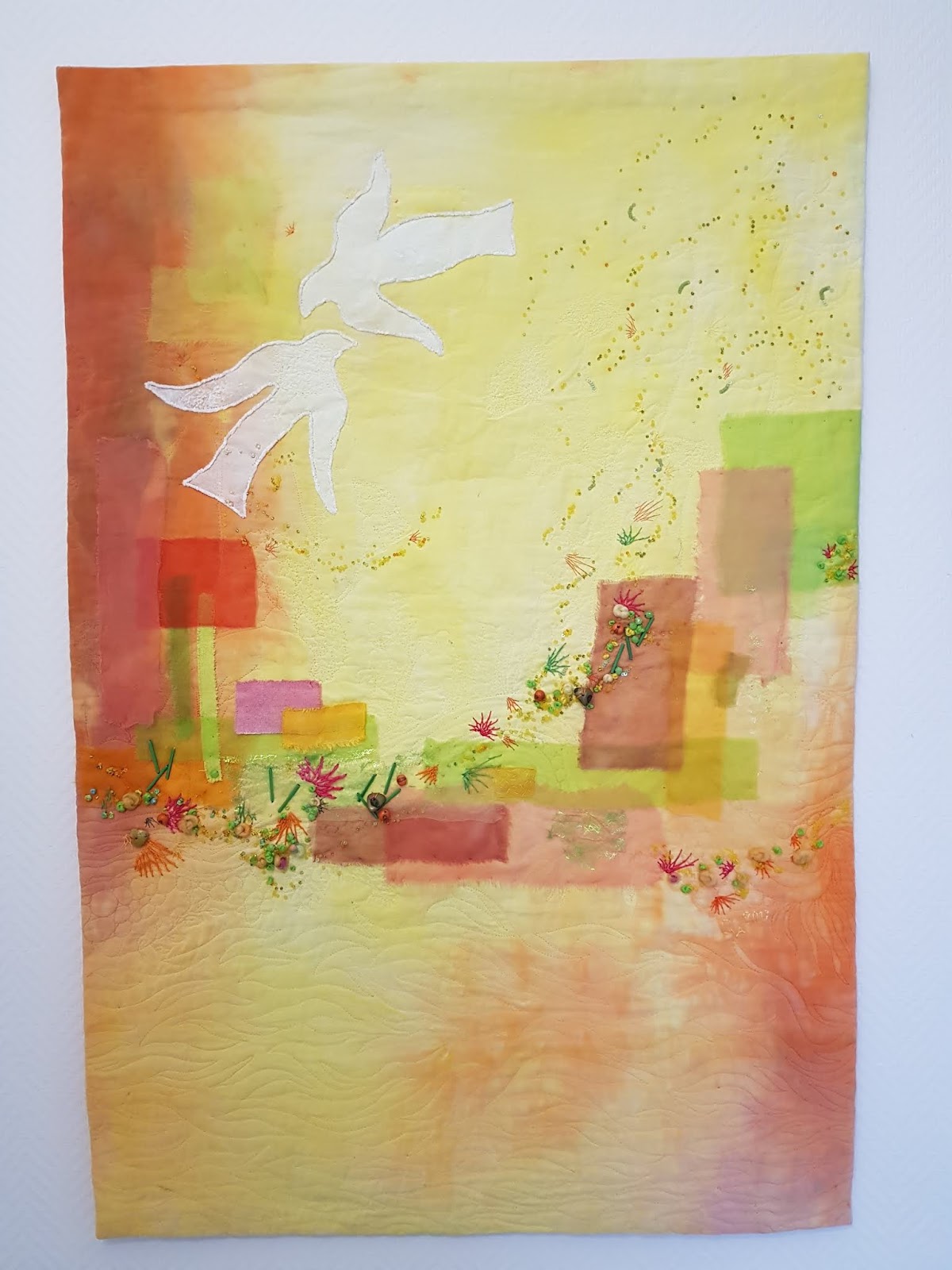 Et si ce défi vous plait, parlez en autour de vous : faisons une belle exposition de tout cela : écriture, céramique, peinture, dessin…textile : tout est bon à travailler….Pour le jaune, je me suis fait la main en préparant le concours pour la Biennale d’Art Textile de Villefranche de 2020. L’Air du Temps : bien entendu, il fallait parler des migrants, de la pollution, de tous ces sujets porteurs … Pour ma part et c’est aussi la philosophie de ce blog, je veux parler de la chance que j’ai d’ouvrir les yeux tous les jours dans un environnement privilégié, entouré de gens qui me soutiennent et m’enrichissent. Mais, surtout, je ne veux pas la garder pour moi : partageons, rayonnons autant que faire se peut !