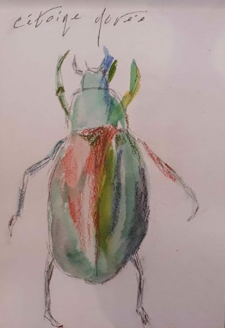 La seule façon de distancier, c’est créer, s’aérer.Écouter une sonate de Debussy, une tendre élégie.Dehors, personne ?Faux, il y a les rendez-vous des mésanges, le chant du merle et les coquelicots qui frémissent à la brise. Pas encore de cétoines dorées sur les fleurs mais en fouillant le compost, d’innombrables de leurs larves. -