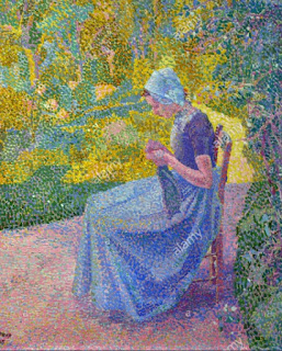 A la fin du XIXe, les impressionnistes sont déjà des novateurs ….anciens ! Les pointillistes ont changé les manières de penser la peinture avec une approche plus optique : si vous posez des points juxtaposés et différemment colorés,  en prenant du recul, vous aurez une impression de ton, un lien entre ces couleurs qui passera, inconsciemment par les couleurs intermédiaires. Si vous peignez ou brodez une zone jaune puis une zone bleue, vous aurez l’impression de voir du vert. Cela vous permet aussi de faire des dégradés subtils. Lors du cours de broderie machine, je vous fais travailler ces mélanges délicats. Les divisionnistes vont aller encore plus loin et s’appuyant sur les travaux de Chevreul.