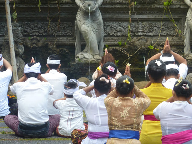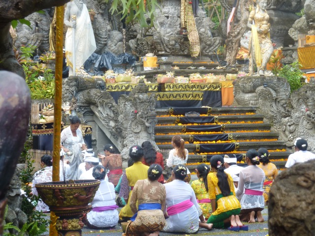 J’ai ressenti profondément la lumière sacrée du jaune un dimanche après-midi, à Bali., en 2015, en assistant à une cérémonie hindouiste en plein air. Le ciel était d’un gris scintillant après la grosse pluie de mousson. Les habitants du quartier, magnifiquement vêtus, ont défilé longtemps sous mes yeux, portant sur la tête leur offrande dans un panier. On m’avait vendu une ceinture jaune que j’avais nouée sur mon vêtement de pluie et en touriste à la fois un peu honteuse et émerveillée, j’ai empli tous mes sens de cette cérémonie joyeuse et élégante, sacrée et tellement humaine. Avant de partir, j’ai ramassé un morceau des tissus jaunes et dorés qui entouraient les divinités, en signe de partage de ce moment de prière à l’univers avec ces personnes habitées par la paix et la douceur.