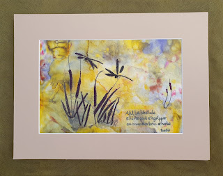 Voici le travail dont je t’ai parlé, “Libellule” travail à partir d’un haïku de Bashô… Comme tu pourras le voir, c’est un petit format (38 x 48 cm avec le cadre vert)…  Il est tout à fait de circonstance en ce printemps..