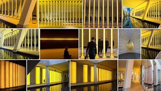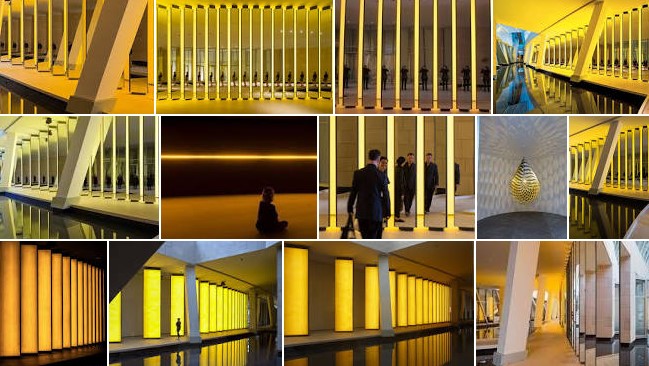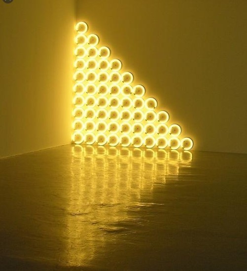 Cet artiste américain ne travaille qu’avec des ampoules fluorescentes. Il faut retenir que c’est aussi un art éphémère puisque lorsque les ampoules lâchent, il parle d’impermanence de son travail. Il fait partie de ce mouvement d’artistes qui jouent la lumière. Nous en avons un exemple avec le travail de Olafur ELIASSON à la fondation Vuitton à Paris. Les lumières jouent avec l’eau et la structure du béton, des miroirs et de la mosaïque vous font perdre vos repères, la musique vous interroge.