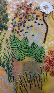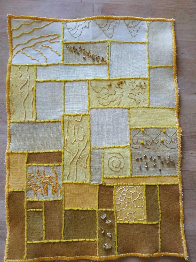 Mon esprit vagabonde en jaune : je pense aux champs de colza et à la broderie que j’ais travaillé maintenant partie chez une dame dont le regard ne décrochait pas de ce tableau et je sais qu’elles vivent bien ensemble… Ma photo est plus sombre qu’en vrai car le jaune est vraiment celui du colza.