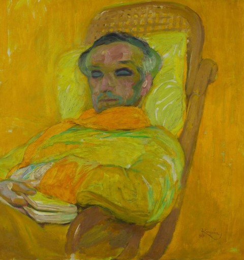 Apres des décennies de désamour de cette couleur au XIXe, le jaune opère un retour dans la peinture. Les travaux de Chevreul sur la couleur suscite un intérêt, voire un engouement qui sera repris par les Nabis, les Fauves, les cubistes entre autres. Tandis qu’au XIXe, le jaune est la couleur de la prostitution et de la transgression, s’en servir devient un signe de modernité. Kupka fera deux tableaux : l’un des personnages a les yeux ouverts et celui-ci aveugle, comme un signe d’intériorité. Ici le personnage est un lecteur. Le vert et le bleu sur le visage, en petites touches donnent l’équilibre dans la composition picturale. L’ensemble pourrait nous faire penser à de la mélancolie bien que jaune, sorte de lecteur isolé dans ses pensées.