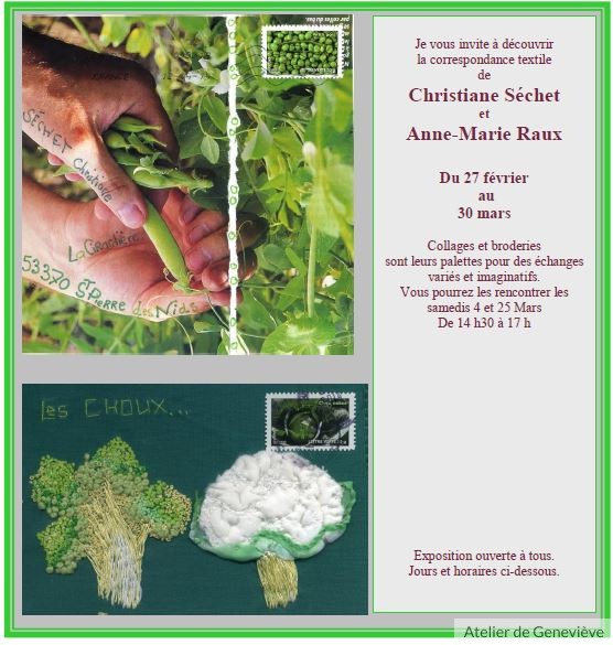 Deux sœurs s’écrivent et jouent les textiles et les collages. Elles nous montrent leur plaisir à s’offrir ces courriers qui parlent de proverbes, de légumes, des péchés capitaux…. Chaque envoi est source d’étonnement. Il est très drôle de voir King Kong tricoté des chaussettes lors des jeux autour de l’alphabet mais en anglais, ou des voir les proverbes joués avec l’autruche qui replie ses pattes autour de son corps et se mélangent à la tête pour passer à la Poste….