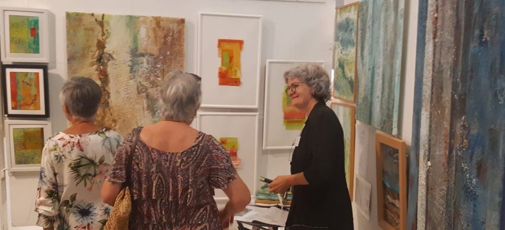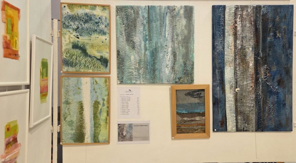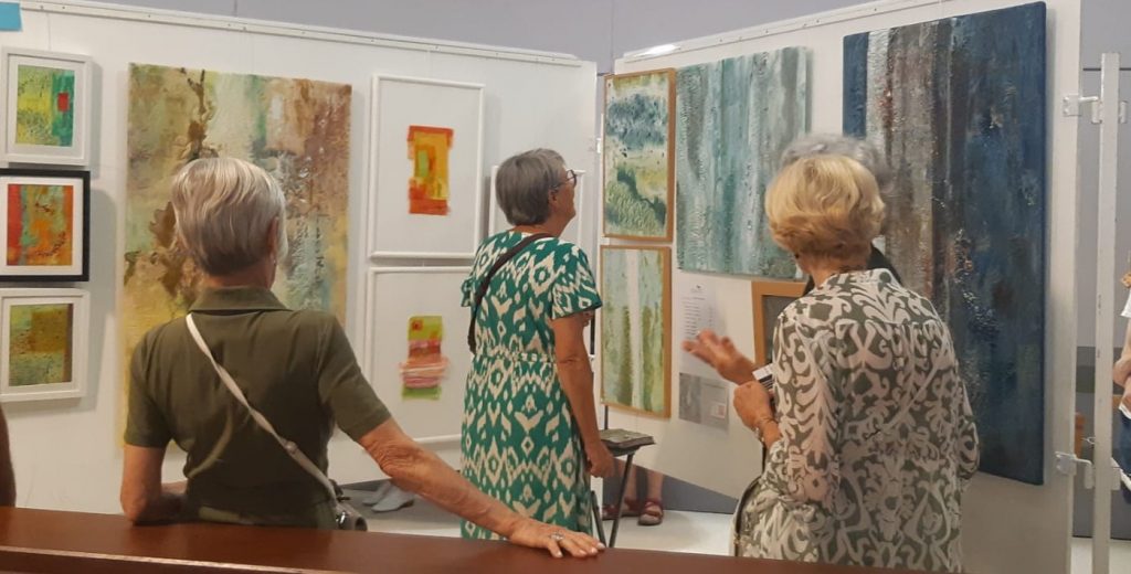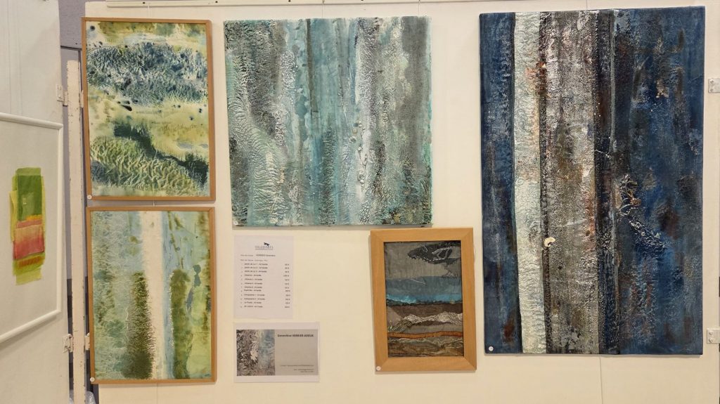 Entres sculpteurs et peintres, je suis la seule représentante de l’art textile. Les regards interrogent la toile, il faut prouver que les petits points sont bien brodés, que les toiles supports sont bien des tissus anciens et que mes gestes sont bien ceux de la Textilienne que je suis.