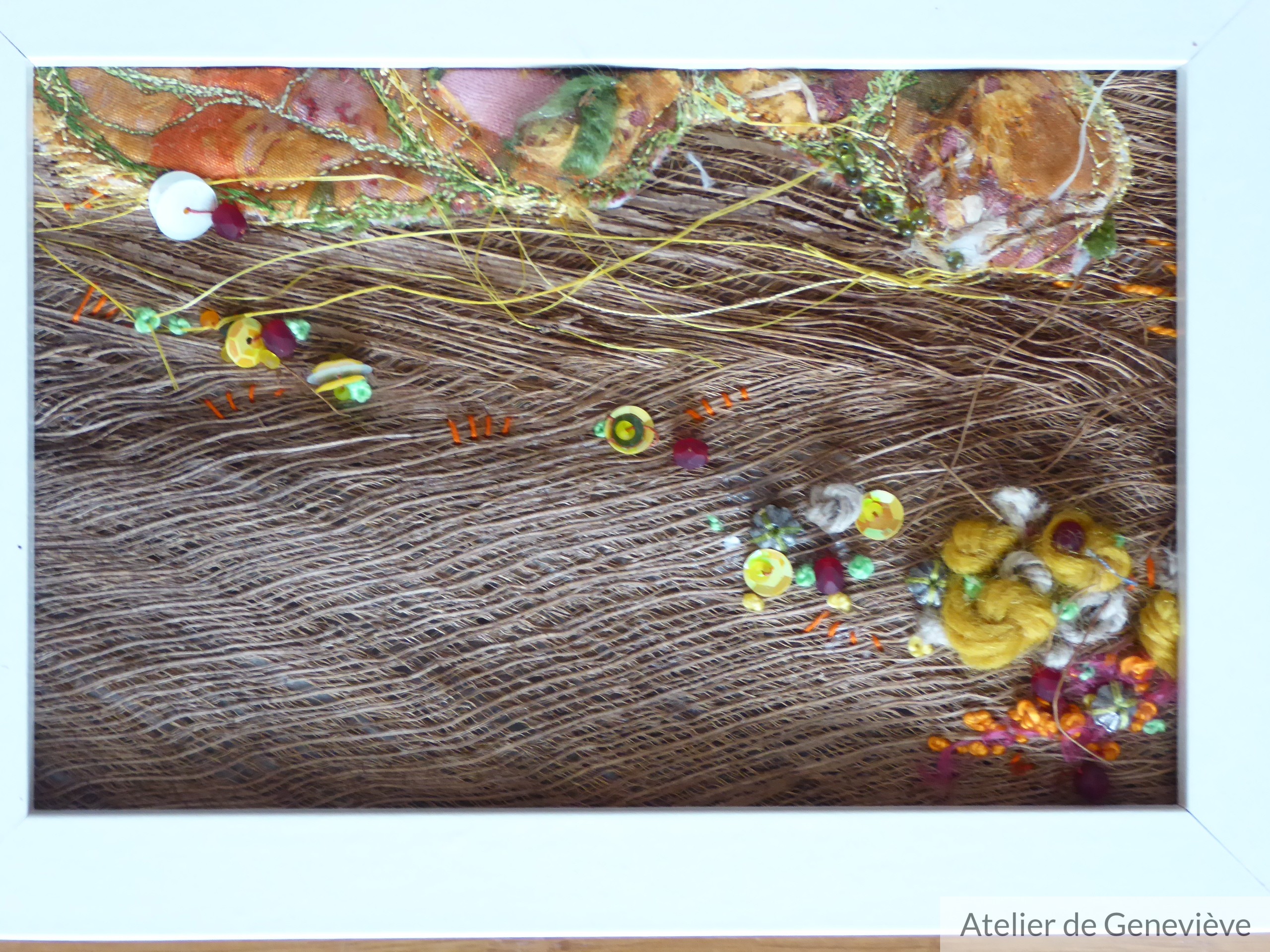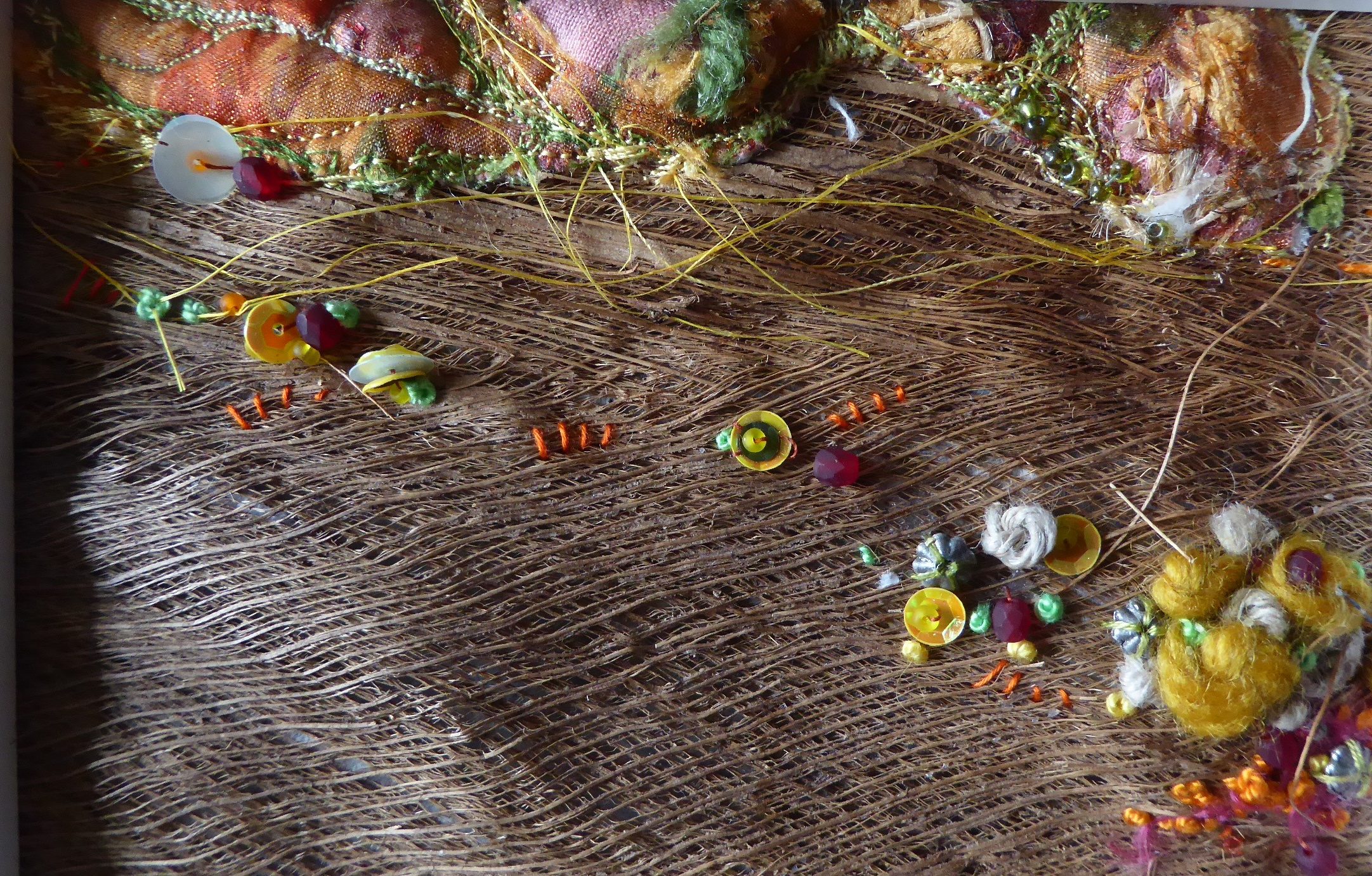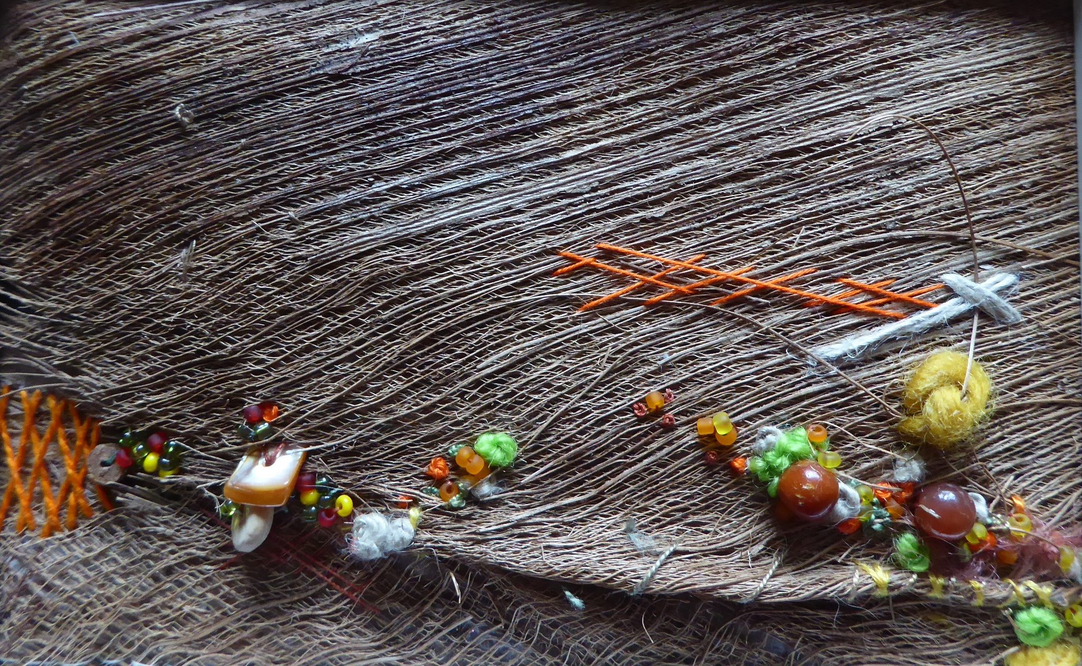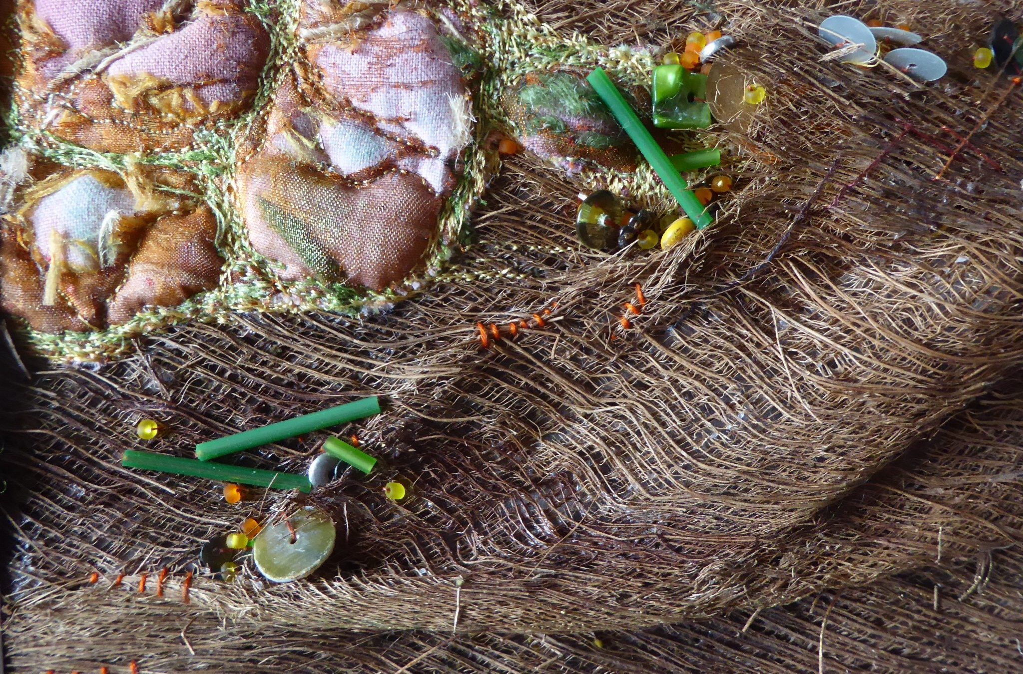 J’ai eu aussi un besoin de travailler sur les écorces : non pas comme je l’avais déjà fait sur le thème des écorces, mais sur les écorces ou les végétaux en support. Ce sont les vignettes du bas ou perlage et piqué libre se promènent sur les feuilles de bananier.
