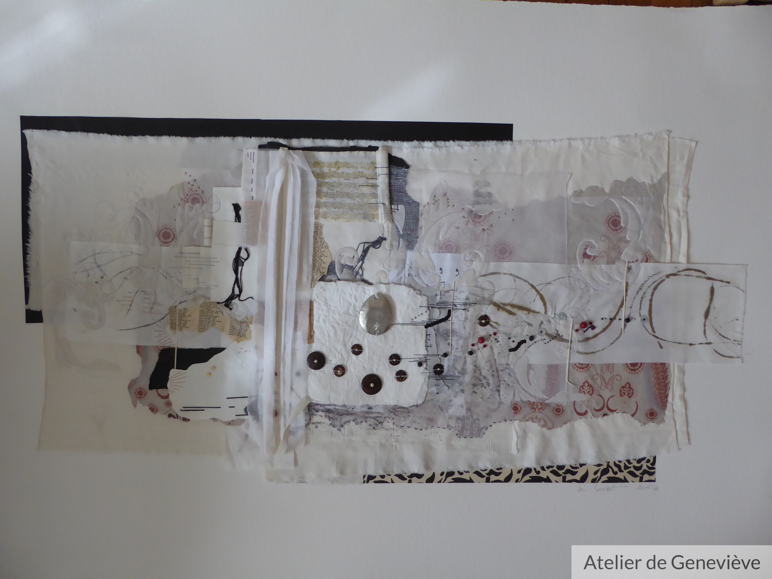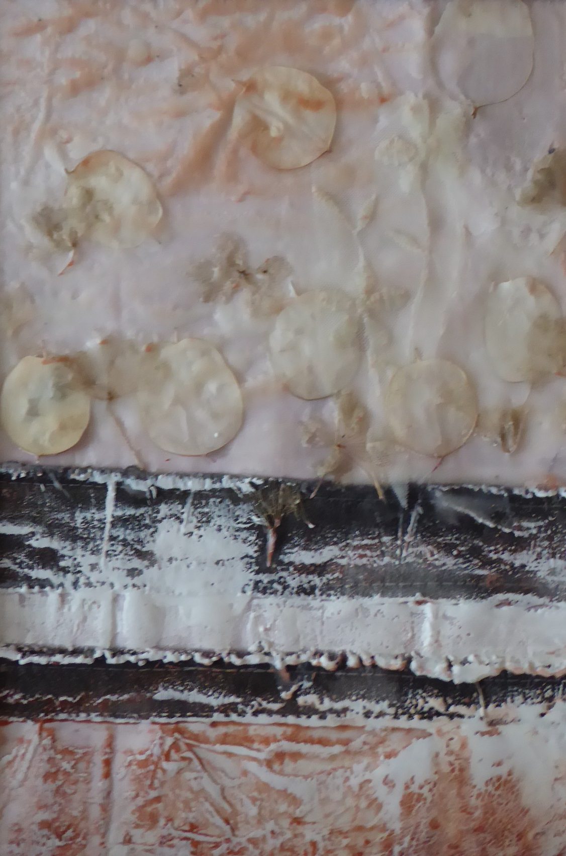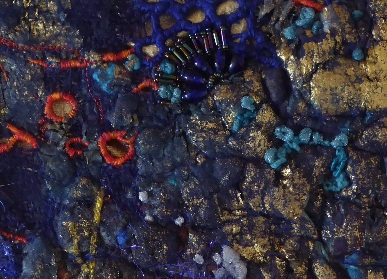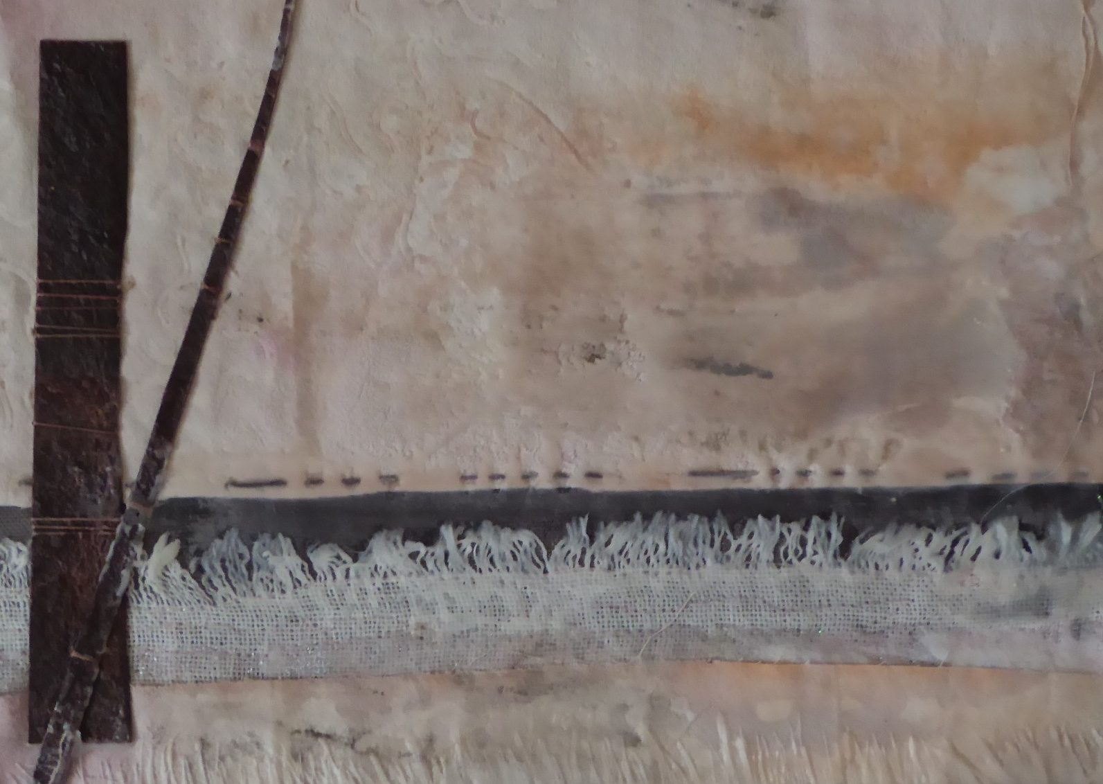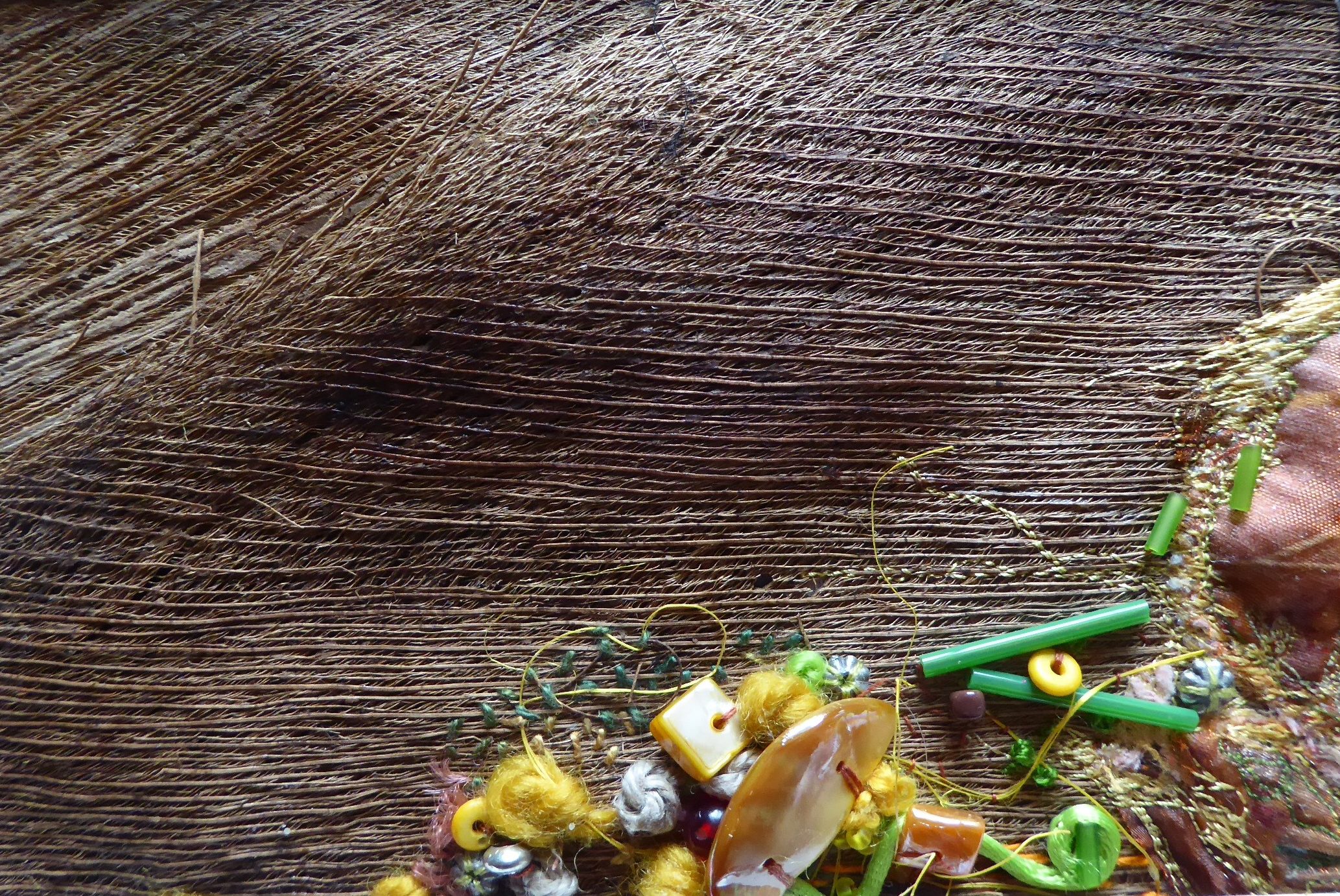 J’ai eu aussi un besoin de travailler sur les écorces : non pas comme je l’avais déjà fait sur le thème des écorces, mais sur les écorces ou les végétaux en support. Ce sont les vignettes du bas ou perlage et piqué libre se promènent sur les feuilles de bananier.