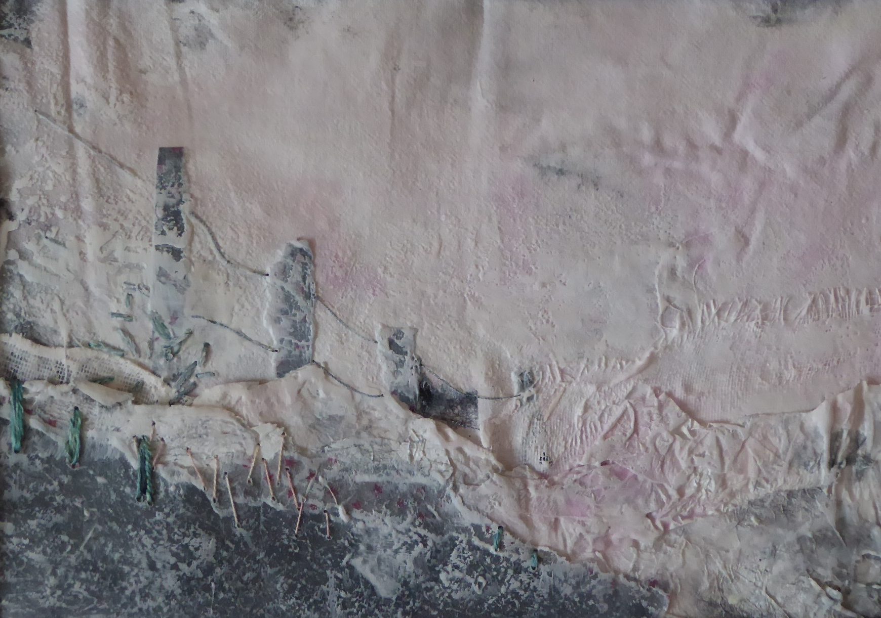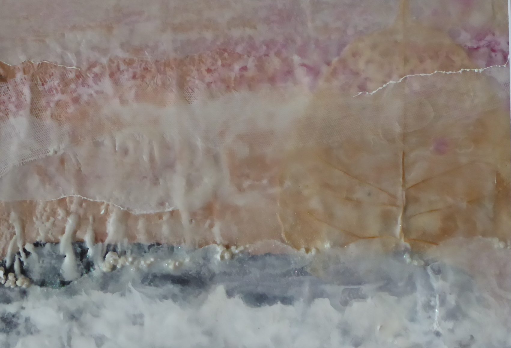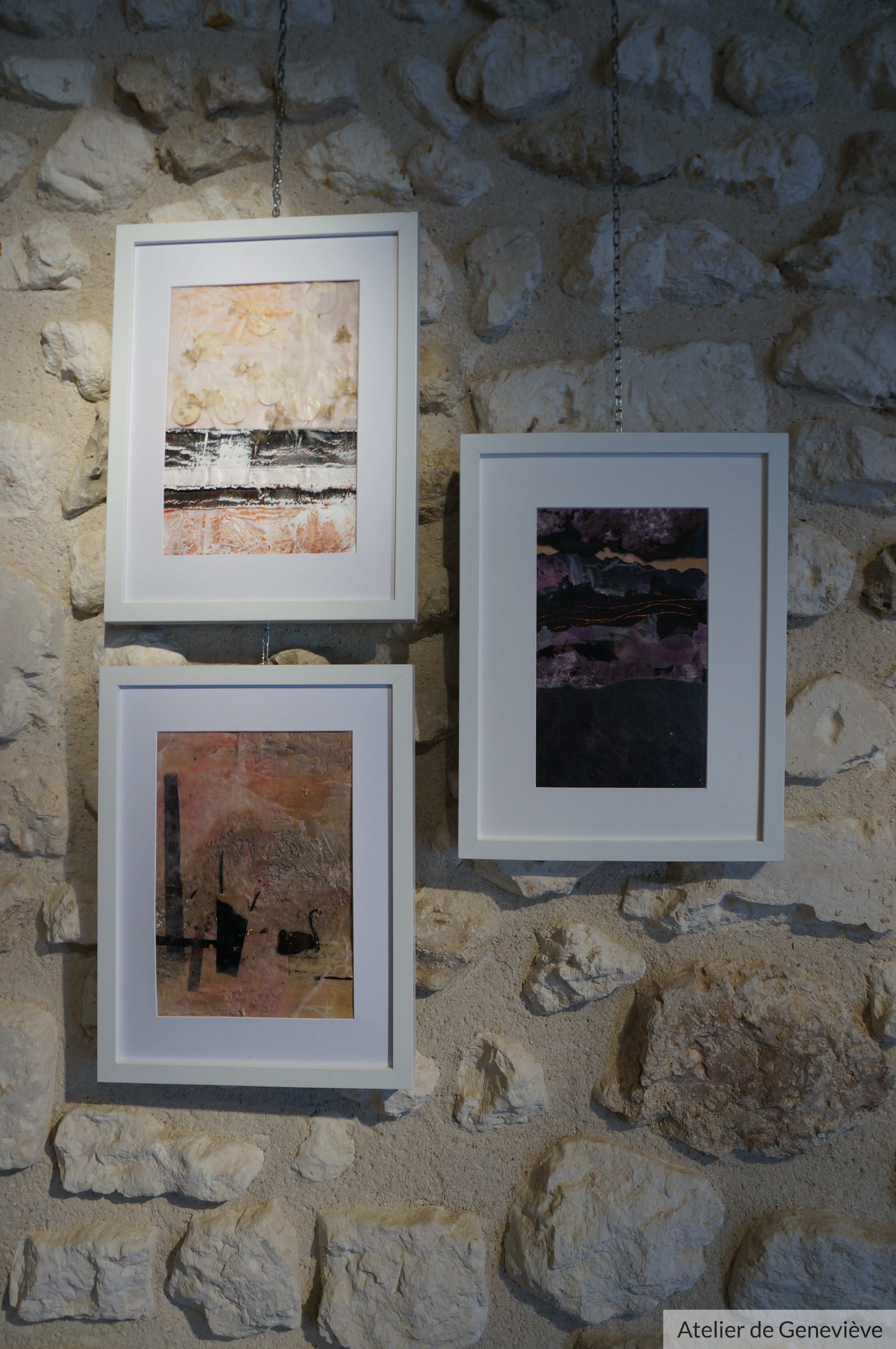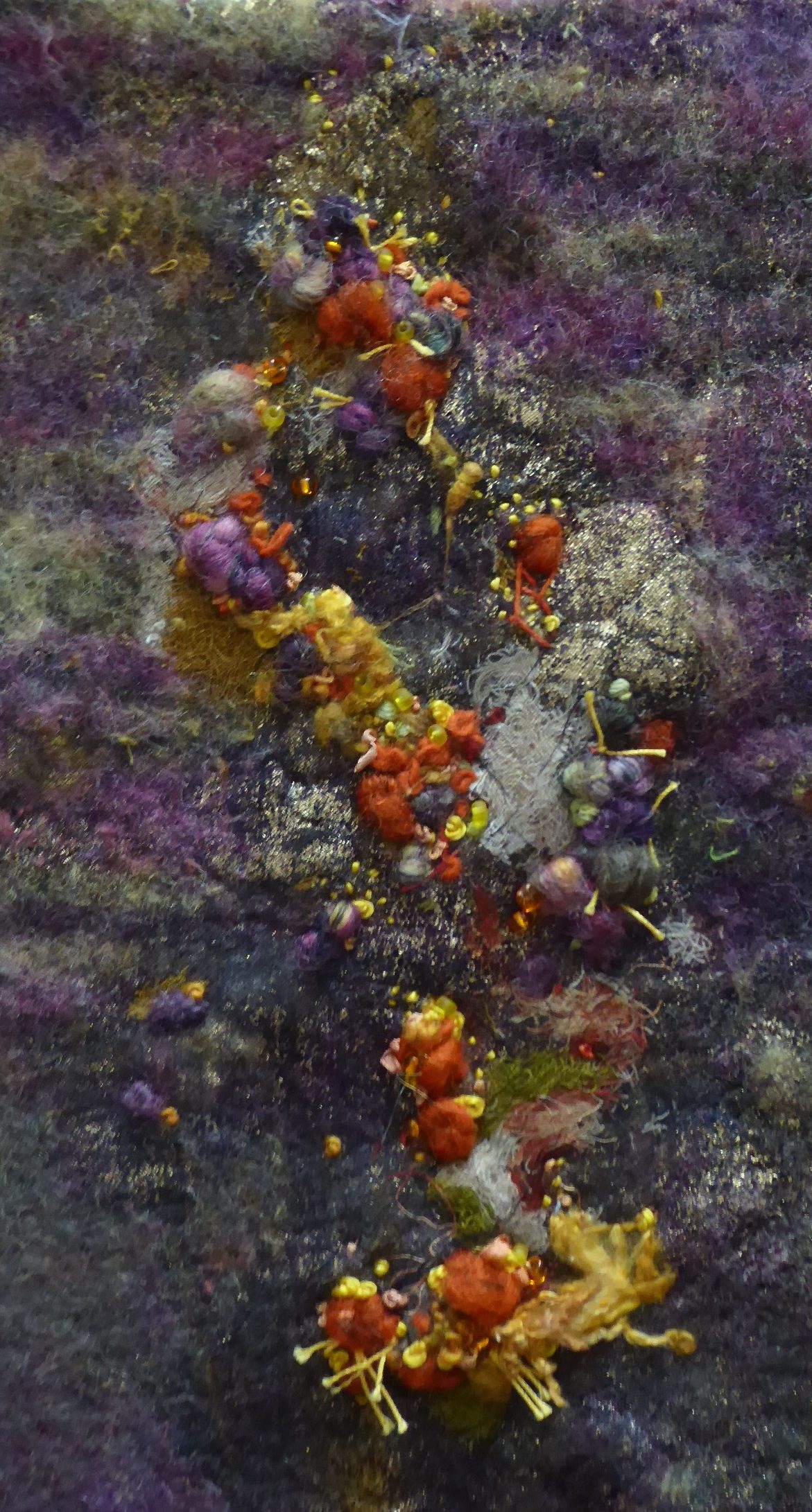 J’ai eu aussi un besoin de travailler sur les écorces : non pas comme je l’avais déjà fait sur le thème des écorces, mais sur les écorces ou les végétaux en support. Ce sont les vignettes du bas ou perlage et piqué libre se promènent sur les feuilles de bananier.