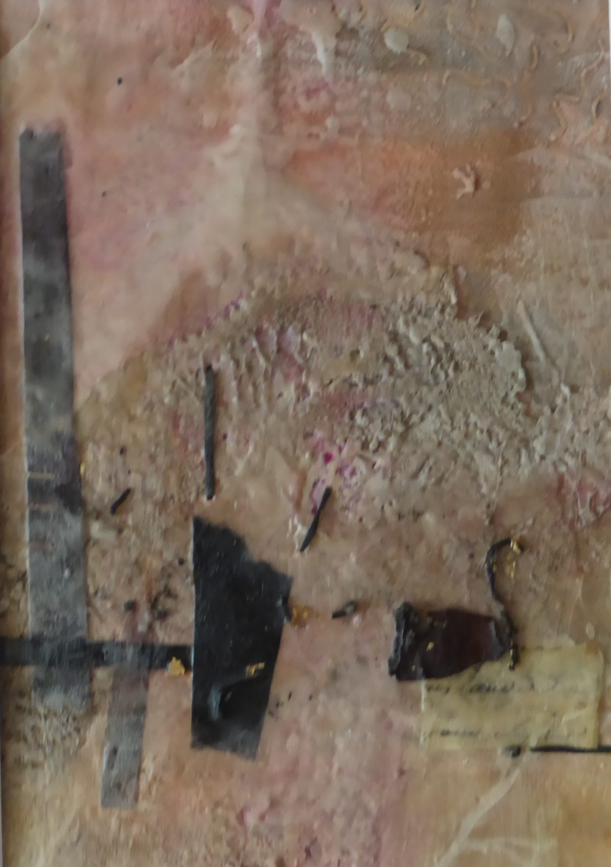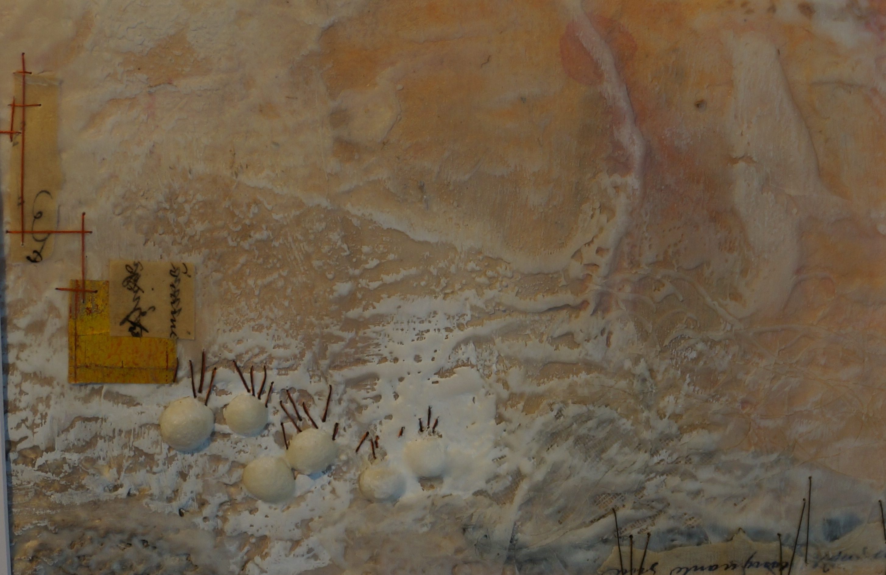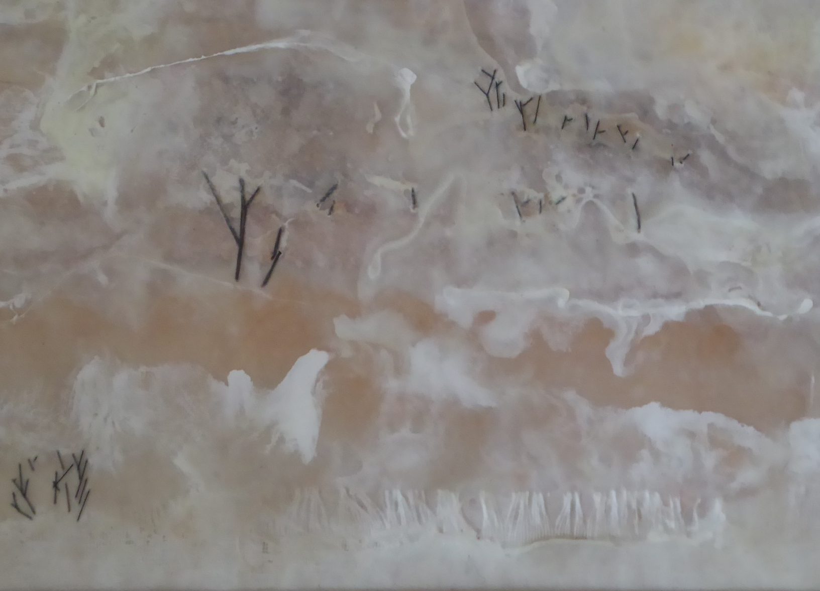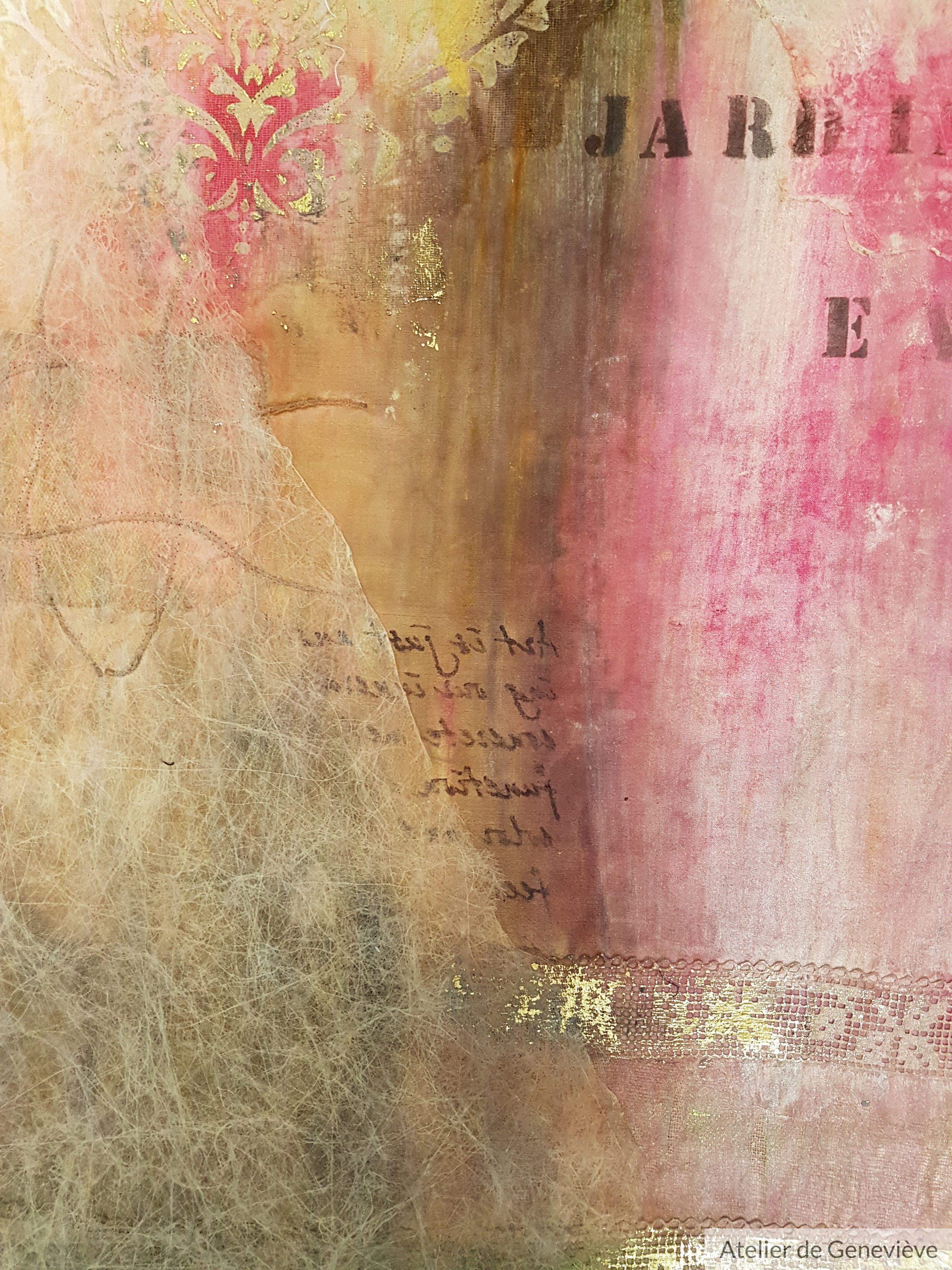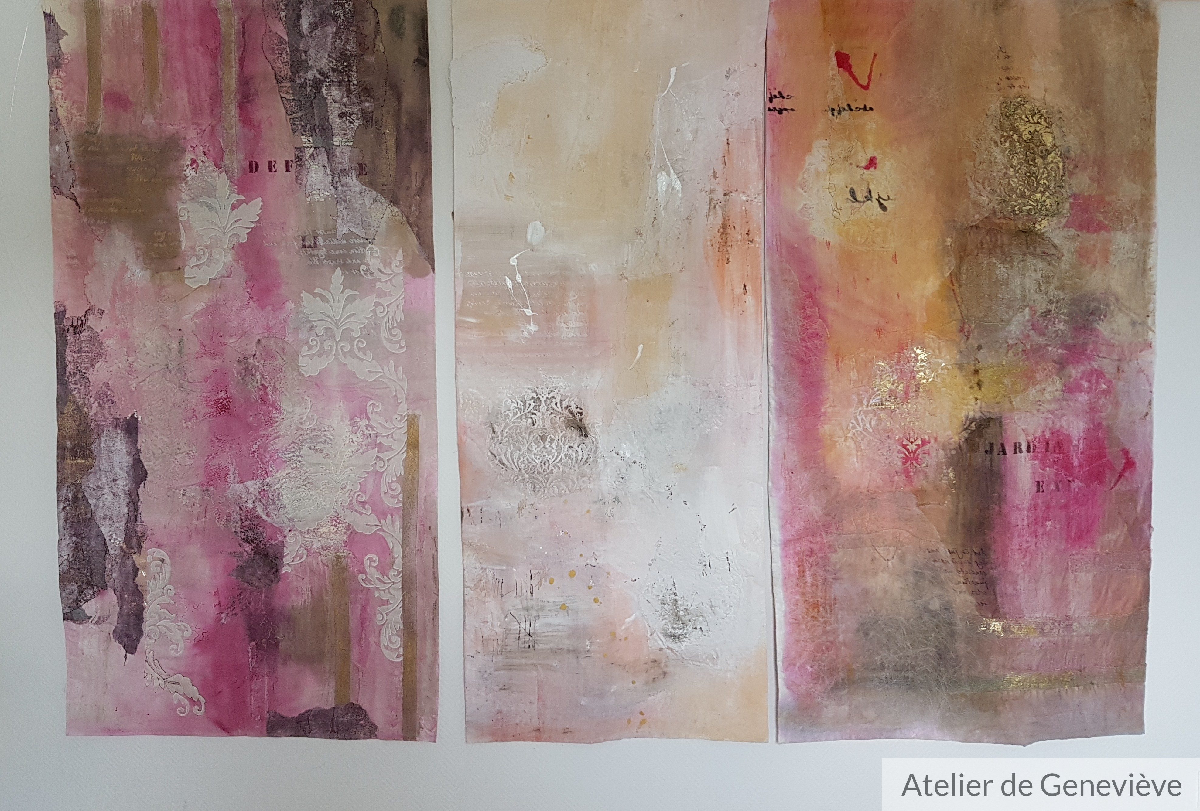 J’ai eu aussi un besoin de travailler sur les écorces : non pas comme je l’avais déjà fait sur le thème des écorces, mais sur les écorces ou les végétaux en support. Ce sont les vignettes du bas ou perlage et piqué libre se promènent sur les feuilles de bananier.